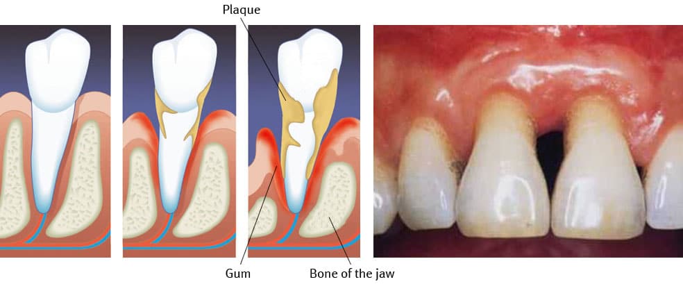 The marginal periodontosis is caused by bacterial plaque, when microorganisms as bacteria, fungi, algae and protozoan within the viscous adherent mucous biofilm get out of balance, in favor of the pathogenic organisms. From approximately 500 different bacteria species within the oral cavity only a few are pathogenic (as cause for periodontosis). By x-ray examination bone reduction can be verified. Results of an increase in pathogenic bacteria are gum bleeding, pocket formation, gum reduction and finally loosening and loss of teeth.